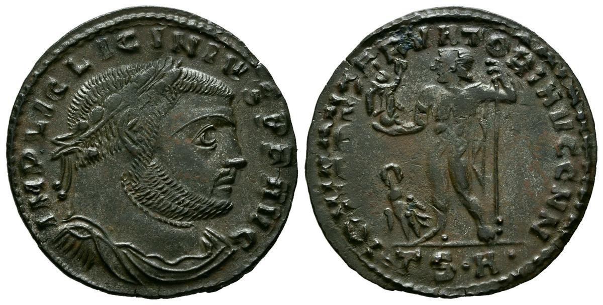 LICINIO I. Follis. (Ae. 3,06g/24mm). 312-313 d.C. Tesalónica. (RIC 60). Anv: Busto laureado, drapeado y con coraza de Licinio I a derecha, alrededor leyenda: IMP LI LICINIVS P F AVG. Rev: Júpiter estante a izquierda portando Victoria con corona de laurel y cetro, a sus pies águila con corona de laurel, en exergo: TSA, alrededor leyenda: IOVI CONSERVATORI AVGG NN. MBC+.