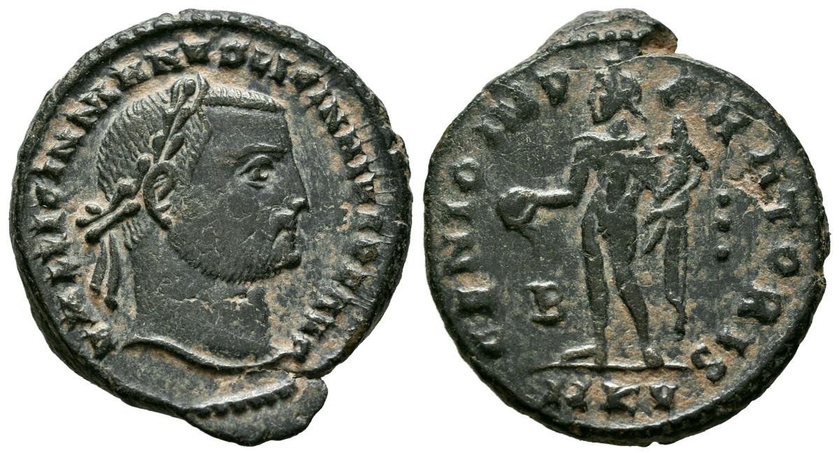 LICINIO I. Follis. (Ae. 6,89g/26mm). 311 d.C. Cícico. (RIC 66). Anv: Busto laureado de Licinio I a derecha, alrededor leyenda: VAL LICINNIANVS LICINNIVS P F AVG. Rev: Genio estante a izquierda portando patera y cornucopia, en campo B y tres puntos, en exergo: MKV, alrededor leyenda: GENIO IMPERATORIS. MBC.