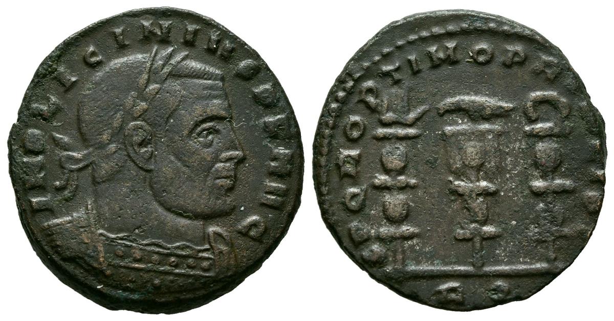 LICINIO I. Follis. (Ae. 4,76g/22mm). 313 d.C. Roma. (RIC 349c). Anv: Busto laureado y con coraza de Licinio I a derecha, alrededor leyenda: IMP LICINIVS P F AVG. Rev: Tres estandartes encima de cada uno, mano, águila y corona de laurel, debajo RO, alrededor leyenda: SPQR OPTIMO PRINCIPI. MBC.