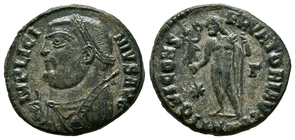LICINIO I. Follis. (Ae. 3,35g/18mm). 308-324 d.C. ¿Antioquía?. (RIC ¿?). Anv: Busto laureado y drapeado a izquierda portando cetro, alrededor leyenda: IMP LICINIVS AVG. Rev: Júpiter estante a izquierda portando Victoria con corona de laurel y cetro, en campo estrella y r, en exergo: ¿ANT?, alrededor leyenda: IOVI CONSERVATORI. MBC.