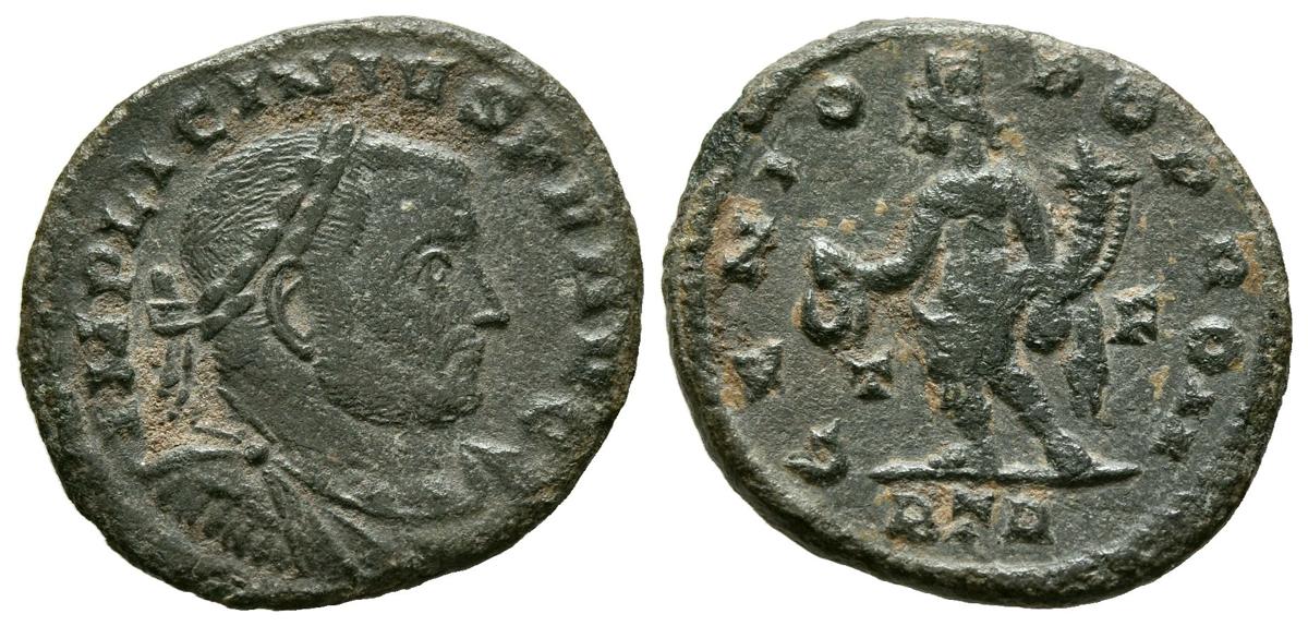 LICINIO I. Nummus. (Ae. 2,64g/20mm). 316 d.C. Treveri. (RIC 120). Anv: Busto laureado y con coraza de Licinio I a derecha, alrededor leyenda: IMP LICINIVS P F AVG. Rev: Genio estante a izquierda portando patera y cornucopia, entre: T-F, en exergo: BTR, alrededor leyenda: GENIO POP ROM. MBC.