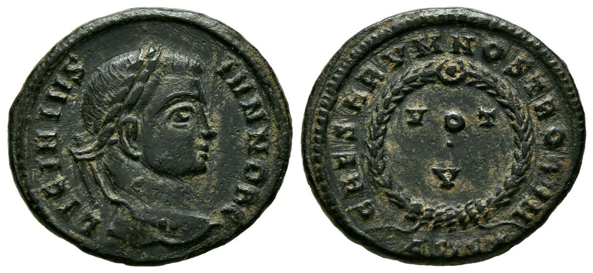 LICINIO II. Follis. (Ae. 3,35g/20mm). 320-321 d.C. Siscia. (RIC 162). Anv: Cabeza laureada de Licinio II a derecha, alrededor leyenda: LICINIVS IVN NOB C. Rev: Leyenda: VOT/V dentro de láurea, debajo: ASIS estrella, alrededor leyenda: CAESARVM NOSTRORVM. MBC+.