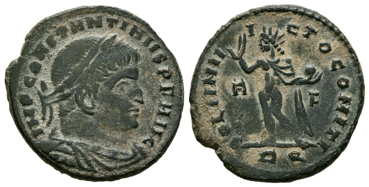 CONSTANTINO I. Follis. (Ae. 3,18g/21mm). 315 d.C. Roma. (RIC 37). Anv: Busto diademado y drapeado de Constantino I a derecha, alrededor leyenda: IMP CONSTANTINVS P F AVG. Rev: Sol estante a izquierda portando globo y alzando mano derecha, entre: S-F, en exergo: RP, alrededor leyenda: SOLI INVICTO COMITI. MBC.