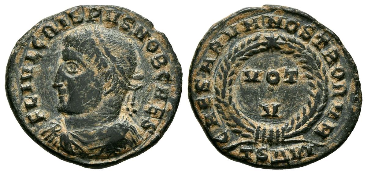 CRISPO. Nummus. (Ae. 2,40g/18mm). 324 d.C. Tesalónica. (RIC 118). Anv: Busto drapeado y laureado de Crispo a izquierda, alrededor leyenda: FL IVL CRISPVS NOB CAES. Rev: Leyenda: VOT/V, dentro de corona de laurel, debajo: TSAVI, alrededor leyenda: CAESARVM NOSTRORVM. MBC.