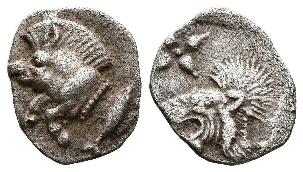MISIA, Cícico. Obolo. (Ar. 0,40g/10mm). 450-400 a.C. (SNG France 361). Anv: Parte delantera de Jabalí a izquierda, detrás atún. Rev: Cabeza de león a izquierda dentro de cuadrado incuso. MBC+.