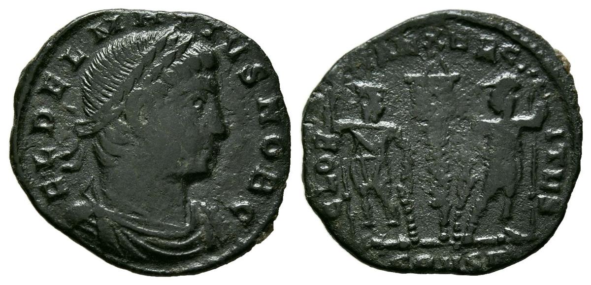 DELMACIO. Follis. (ae. 1,25g/17mm). 336-337 d.C. Constantinopla. (RIC 141). Anv: Busto dieademado y drapeado de Delmacio a derecha, alrededor leyenda: FL DELMATVS NOB C. Rev: Dos soldados estantes enfrentados portando lanza y apoyándose en escudo, entre ellos estandarte, en exergo: CONSI, alrededor leyenda: GLORIA EXERCITVS. MBC+/MBC.