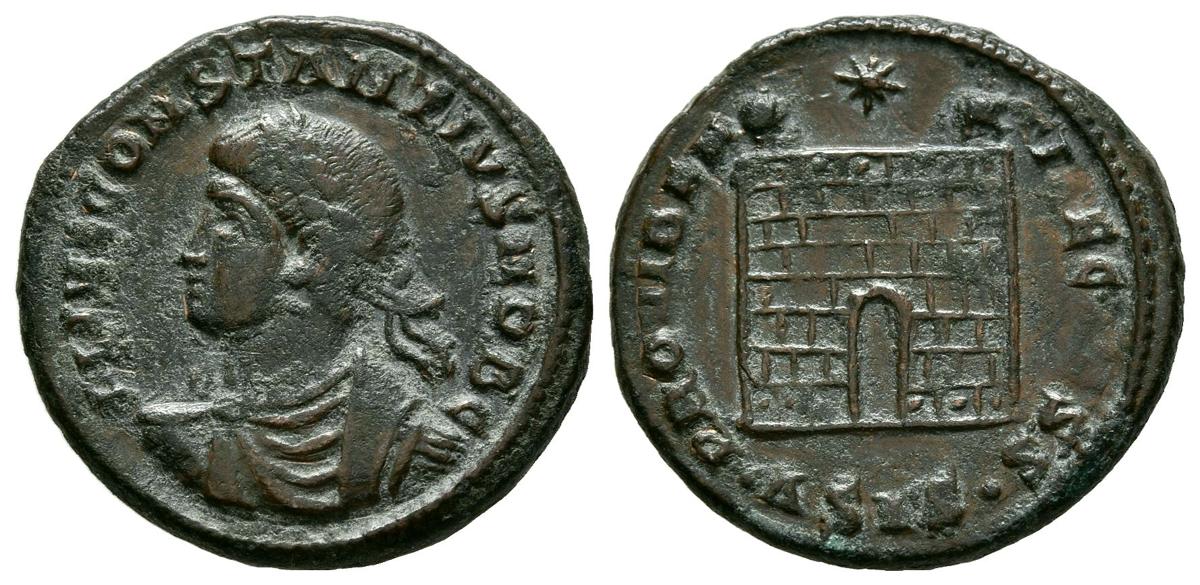 CONSTANCIO II. Follis. (Ae. 3,38g/19mm). 326-327 d.C. Siscia. (RIC 203). Anv: Busto laureado, drapeado y con coraza de Constancio II a izquierda, alrededor leyenda: FL IVL CONSTANTIVS NOB C. Rev: Puerta de campamento con dos torretas encima, entre ellas estrella, en exergo: ASIS, alrededor leyenda: PROVIDENTIAE CAESS. MBC+.