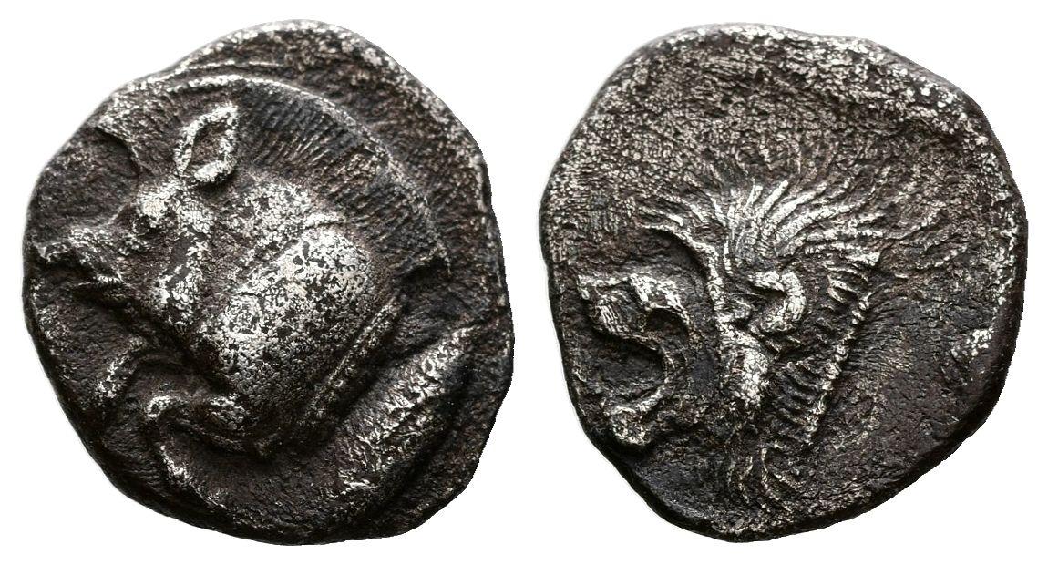 MISIA, Cícico. Obolo. (Ar. 0,86g/10mm). 450-400 a.C. (SNG France 361). Anv: Parte delantera de Jabalí a izquierda, detrás atún. Rev: Cabeza de león a izquierda dentro de cuadrado incuso. MBC.