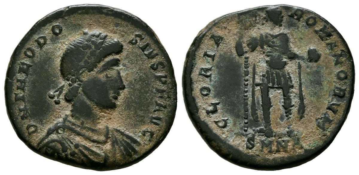 TEODOSIO I. Follis. (Ae. 4,73g/22mm). 392-394 d.C. Nicomedia. (RIC 46). Anv: Busto diademado y drapeado de Teodosio I a derecha, alrededor leyenda: D N THEODOSIVS P F AVG. Rev: Teodosio estante a derecha portando estandarte y globo, en exergo: SMNA, alrededor leyenda: GLORIA ROMANORVM. MBC-.