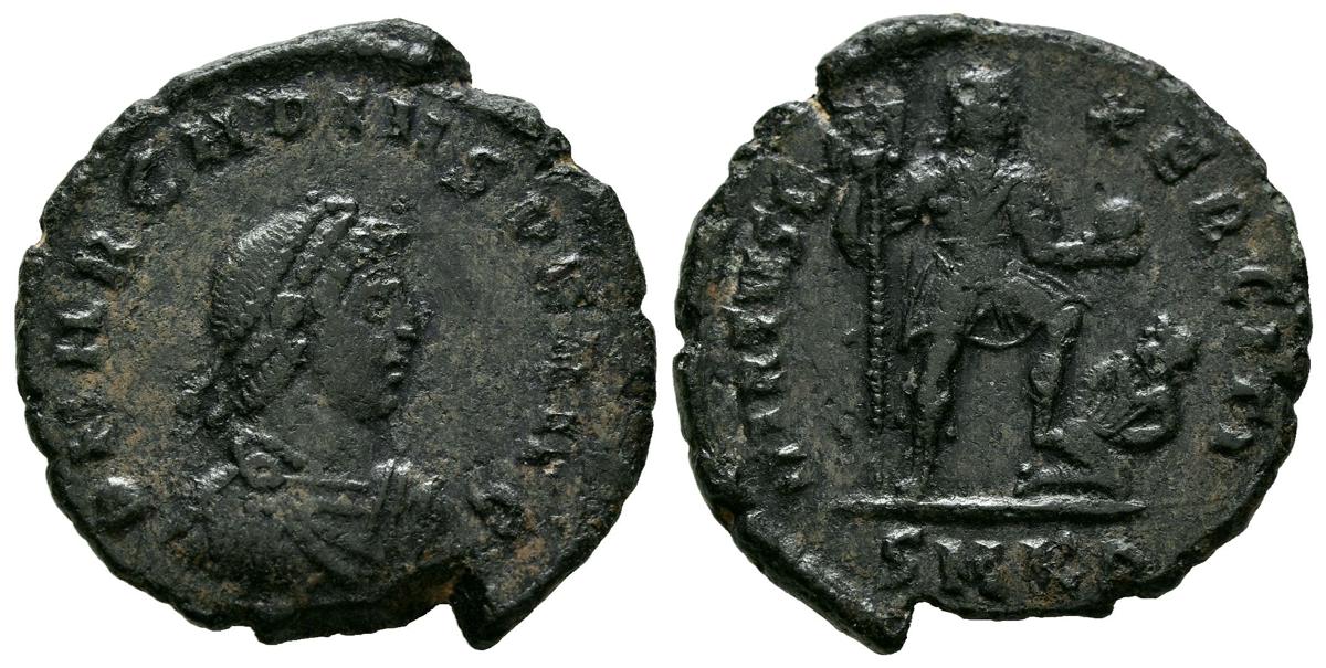 ARCADIO. Follis. (Ae. 4,79g/23mm). 378-383 d.C. Cícico. (RIC 25c). Anv: Busto diademado, drapeado y con coraza de Arcadio a derecha, alrededor leyenda: D N ARCADIVS P F AVG. Rev: Arcadio estante a derecha portando labarum y globo con pie sobre cautivo, en exergo: SMKA, alrededor leyenda: VIRTVS EXERCITI. MBC-.