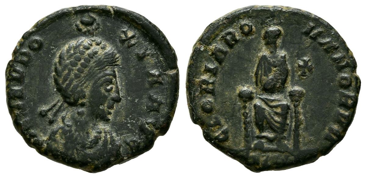 AELIA EUDOXIA. Ae17. (Ae. 2,82g/17mm). 395-404 d.C. Ceca Ilegible. (RIC ¿?). Anv: Busto drapeado y diademado de Aelia Eudoxia a derecha, alrededor leyenda: AEL EVDOXIA AVG. Rev: Aelia Eudoxia sentada de frente, en campo cruz, alrededor leyenda: GLORIA ROMANORVM. MBC+/MBC.