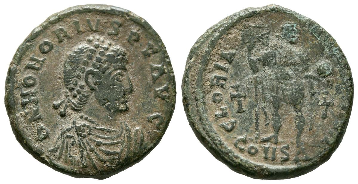 HONORIO. Ae20. (Ae. 5,21g/21mm). 392-395 d.C. Constantinopla. (RIC 88c). Anv: Busto diademado, drapeado y con coraza a derecha, alrededor leyenda: DN HONORIVS PF AVG. Rev: Honorio estante a derecha portando estandarte, en exergo: CONSA, entre él dos cruz , alrededor leyenda: GLORIA ROMANORVM. MBC+.