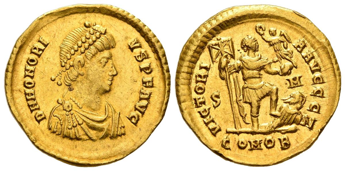 HONORIO. Sólido. (Au. 4,45g/20mm). 393-395 d.C. Sirmium. (RIC 15d). Anv: Busto diademado, drapeado y con coraza de Honorio a derecha, alrededor leyenda: D N HONORIVS P F AVG. Rev: Honorio estante a derecha con pie sobre cautivo en el suelo a izquierda portando estandarte y Victoria con corona de laurel sobre globo, entre S-M, en exergo: CONOB, alrededor leyenda: VICTORIA AVGGG Z. EBC. Restos de brillo original. Bonito ejemplar, escaso así.