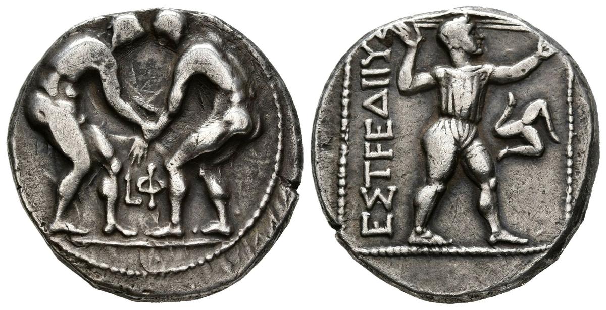 PAMPHYLIA, Aspendos. Estátera. (Ar. 10,55g/22mm). 380-330 a.C. (SNG Copenhagen 227). Anv: Dos luchadores agarrándose entre ellos, entre ellos L y letra griega. Rev: Hondero a derecha, detrás leyenda griega, delante triskeles. MBC+.