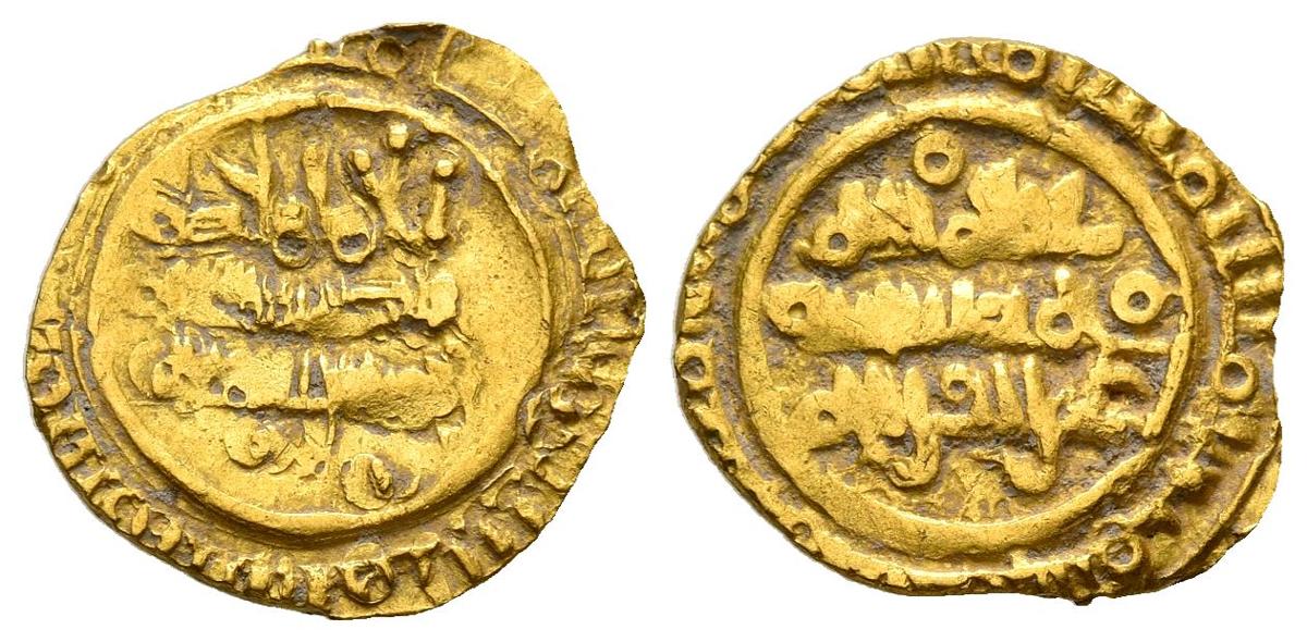 ACUÑACIONES ANÓNIMAS DEL MAGREB. Al-Hakim bi-Amr Allah. Imitación de un dinar fraccionario del califa fatimí (Au. 1,18g/13mm). 386-411 H. Tipo de Siqilliya. El tipo de epigrafía y los errores ortográficos delatan un origen norteafricano bien como imitación de un numerario de prestigio o fruto de aliados circunstanciales de los fatimíes. MBC+. Muy rara.