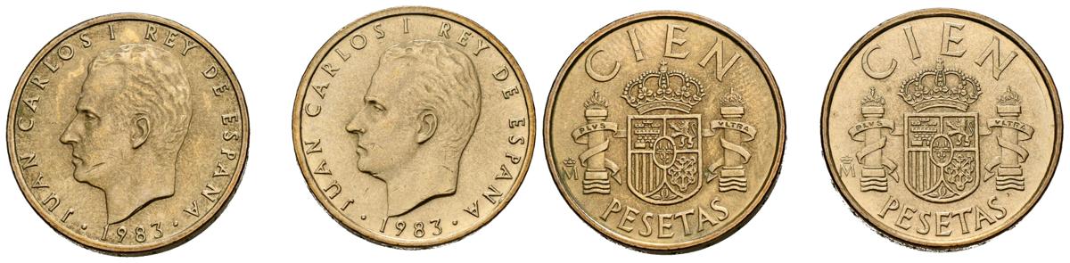 JUAN CARLOS I (1975-2014). Conjunto de 2 monedas de 100 Pesetas de 1983 con flores de lis, en el canto, hacia arriba y hacia abajo. EBC. Marquitas en ambas piezas.