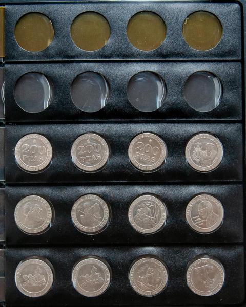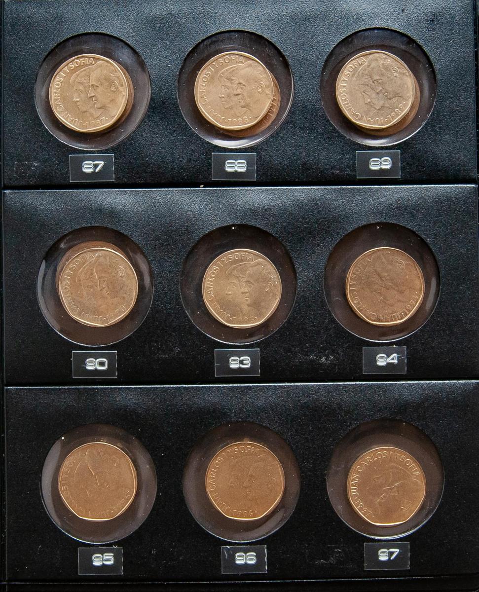 JUAN CARLOS I (1975-2014). Hojas pardo compuesta por 36 monedas de 100 Pesetas, acuñadas entre 1982 y 2001. Alto nivel de conservación en general. A EXAMINAR.