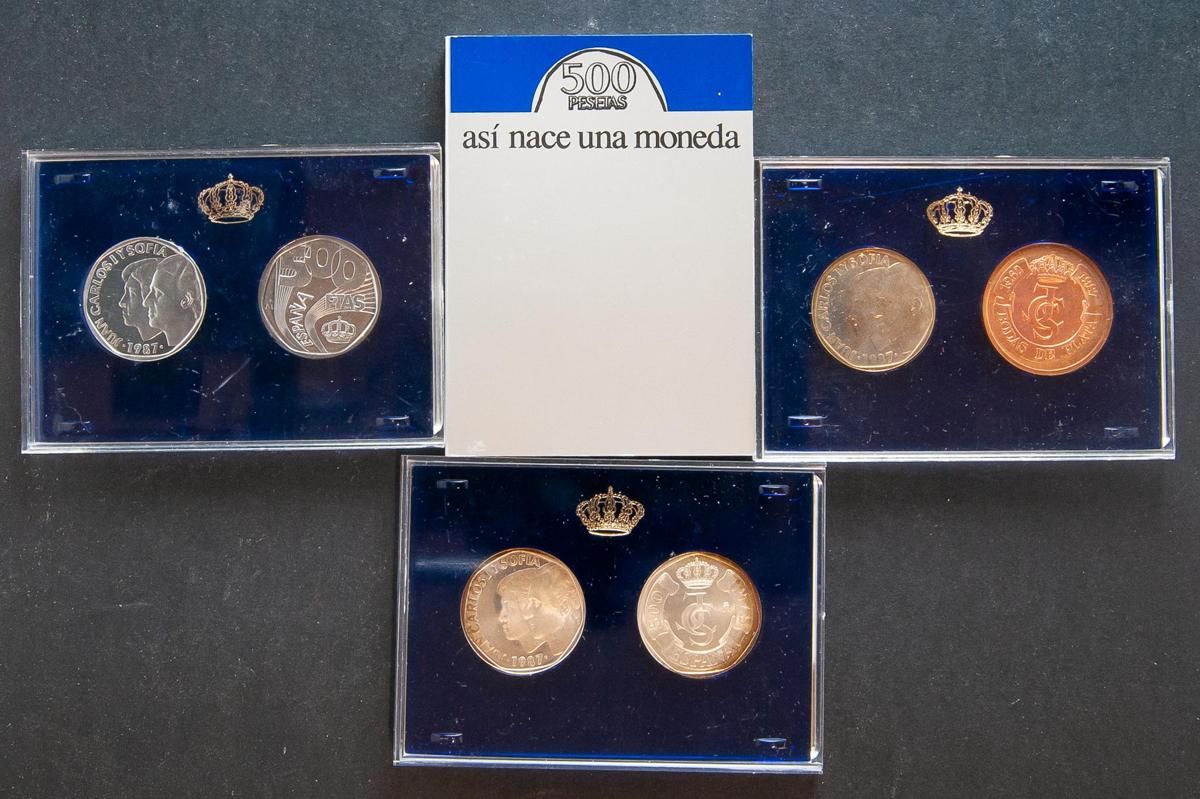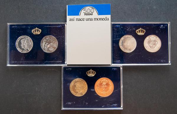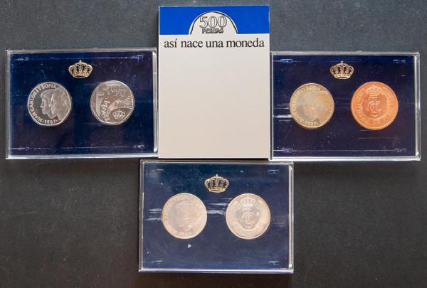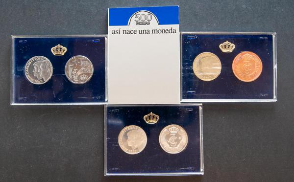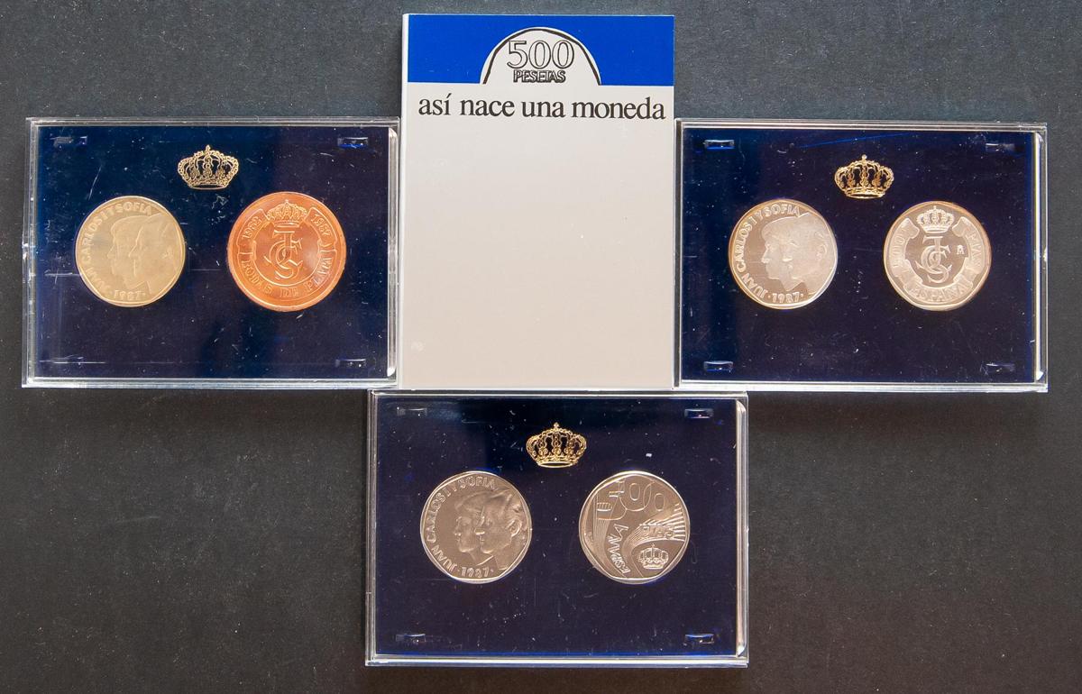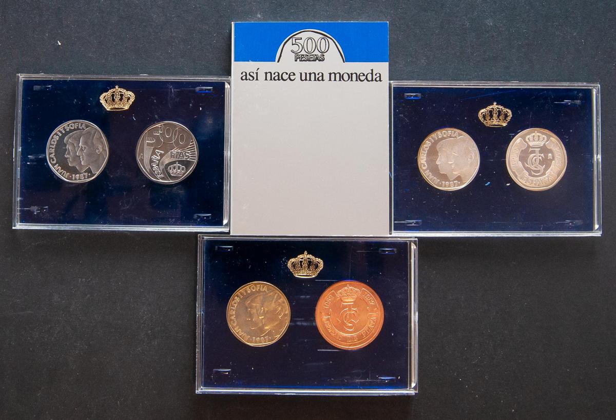 JUAN CARLOS I (1975-2014). 500 Pesetas. Pruebas de la FNMT. Estuche conmemorativo XXV Aniversario de la Boda de los Reyes Juan Carlos I y Sofía. El set incluye 6 monedas y librito Así nace una moneda. 1987. SC.
