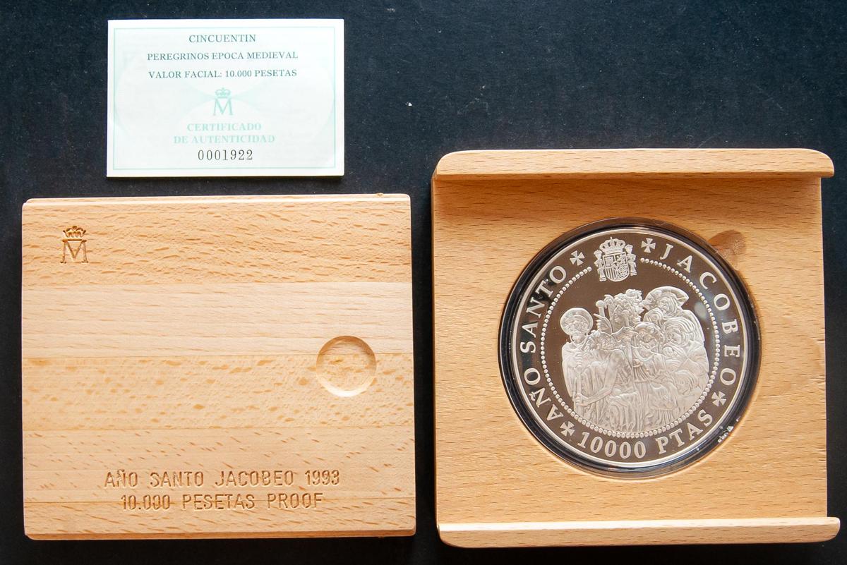 JUAN CARLOS I (1975-2014). 10.000 Pesetas (Ar. 168,75g/73mm). Año Santo Jacobeo. Peregrinos Época Medieval. 1993. FNMT. PROOF. Incluye estuche original y certificado de autenticidad.