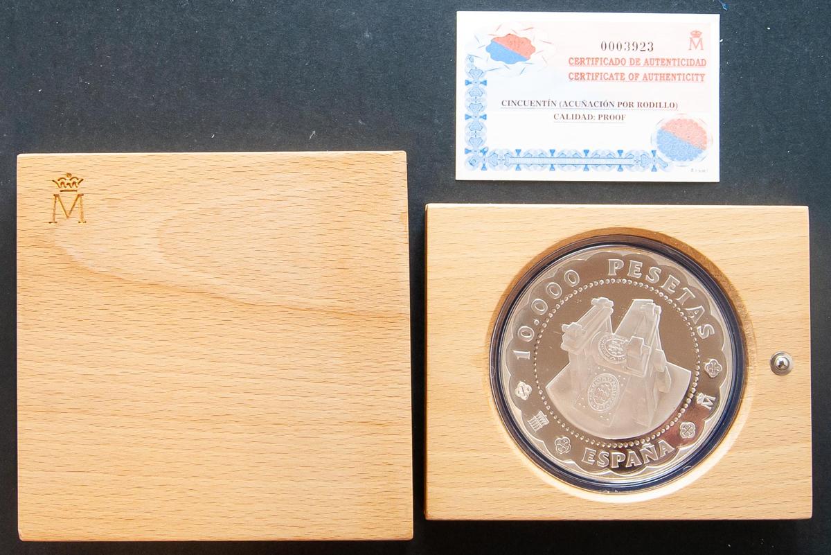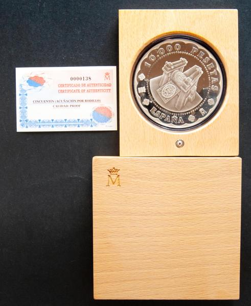 JUAN CARLOS I (1975-2014). 10.000 Pesetas. (Ar. 168,75g/73mm). Cincuentín. Juan Carlos I y Felipe VI. 1998. FNMT. PROOF. Presentada en estuche oficial con certificado de autenticidad. Tirada de 12 mil unidades.