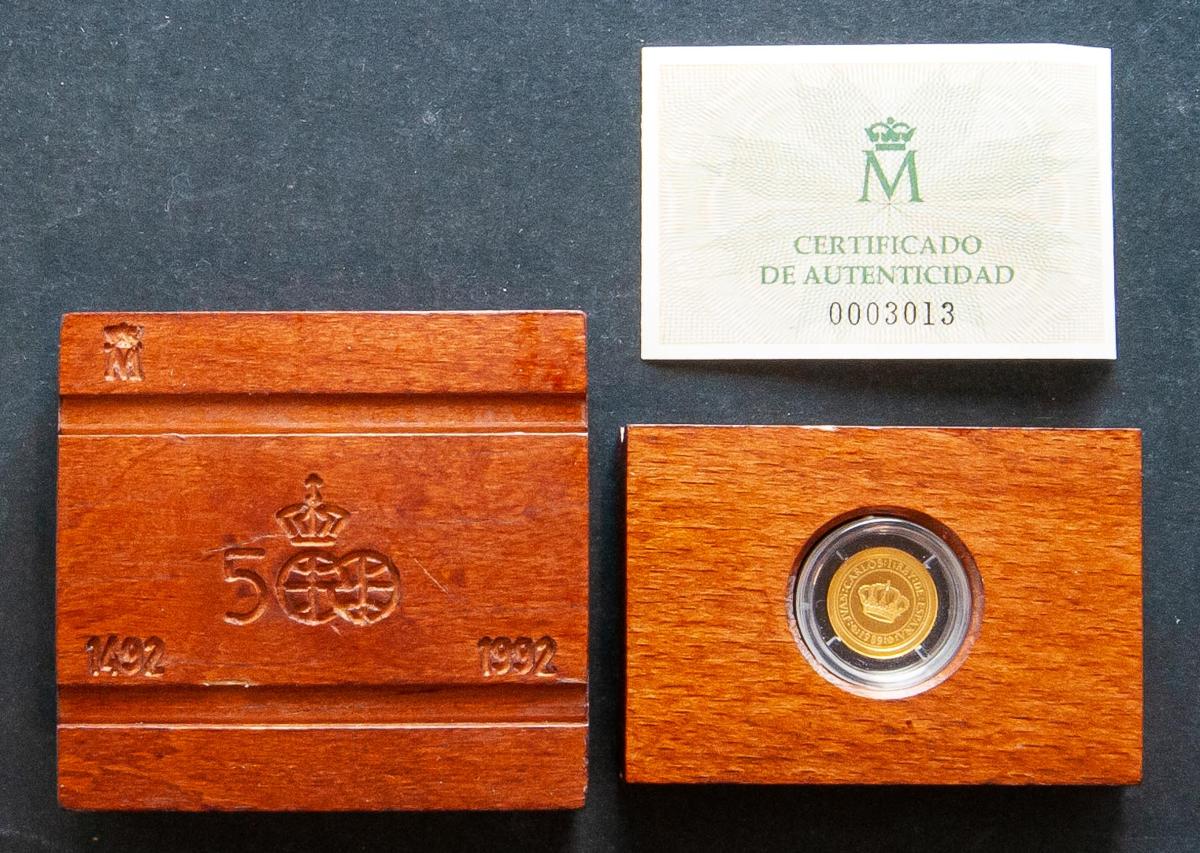 JUAN CARLOS I (1975-2014). 10.000 Pesetas. (Au. 3,37g/19mm). Serie I. Quinto Centenario. 1989. FNMT. FDC. Sólo 17.000 unidades acuñadas. Incluye estuche original y certificado de autenticidad.