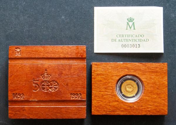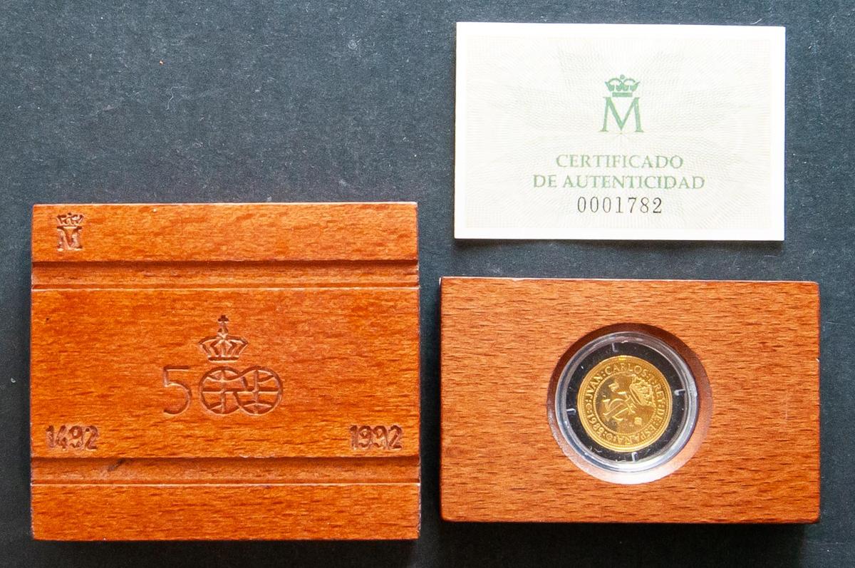 JUAN CARLOS I (1975-2014). 5.000 Pesetas. (Au. 1,68g/15mm). Serie I. Quinto Centenario. 1989. FNMT. FDC. Sólo 32.000 unidades acuñadas. Incluye estuche original y certificado de autenticidad.