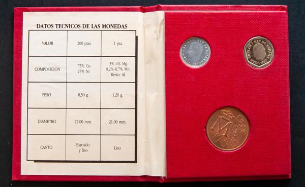 JUAN CARLOS I (1975-2014). Serie completa de 1 y 200 Pesetas más medalla conmemorativa. 1987 *E-87. III Exposición Nacional de Numismática. En cartera original de la FNMT. PROOF.