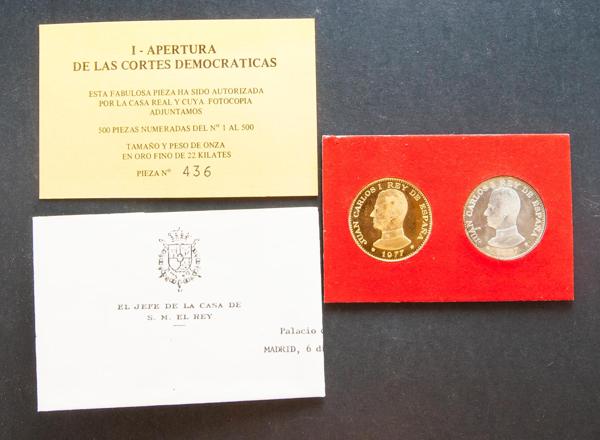 JUAN CARLOS I. Conjunto de dos medallas, una en oro (Au. 25,29g/36mm) y otra en plata (Ar. 16,43g/36mm). 1977. "Conmemoración de la Apertura de las Cortes Democráticas". PROOF. Presentadas en estuche original con certificado.