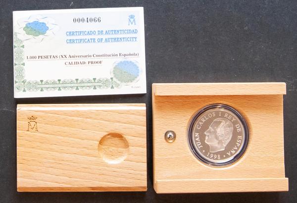 JUAN CARLOS I (1975-2014). 1000 Pesetas. (Ar. 13,50g/33mm). 1998. FNMT. XX Aniversario de la Constitución Española. PROOF. Presentada en estuche oficial y con certificado de autenticidad.