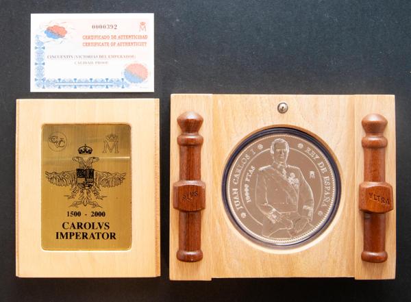 JUAN CARLOS I (1975-2014). 10.000 Pesetas (Ar. 168,75g/73mm). V Centenario Carolvs V. 2000. FNMT. PROOF. Incluye estuche original y certificado de autenticidad. Tirada de 9000 unidades.