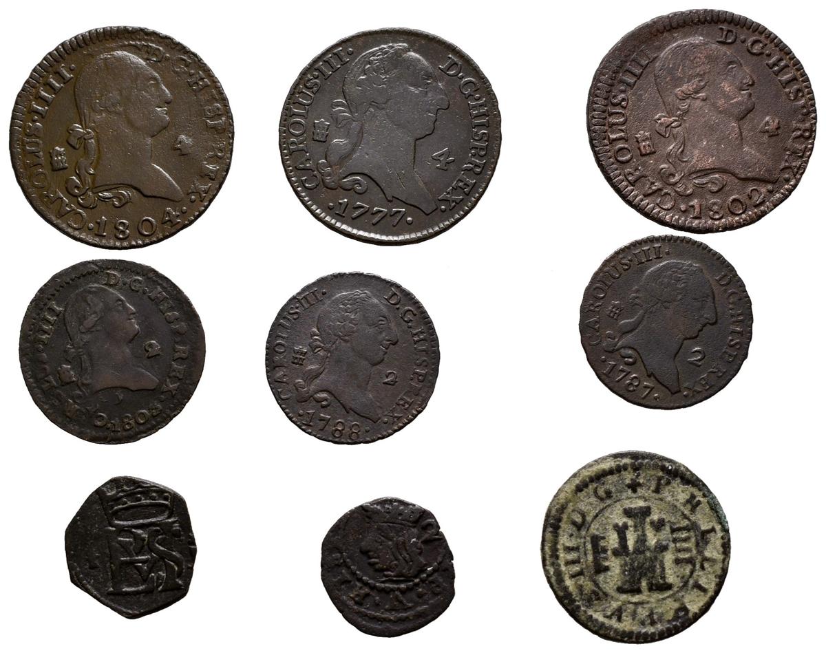 Magnífico conjunto compuesto por 85 monedas en plata (49) y cobre (36) acuñadas entre los reinados de Felipe III e Isabel II. El conjunto incluye un buen número de monedas de 8 Reales así como una gran variedad de módulos,fechas y cecas. Sin apenas piezas repetidas. Diferentes estados de conservación. A EXAMINAR.