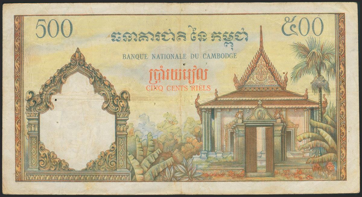 CAMBODIA. 500 Riels. 1968. (Pick: 14c). Pinholes, a bit dirty. Very Fine.