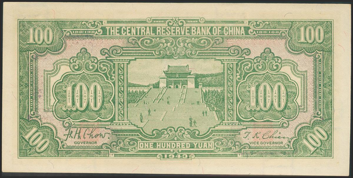 CHINA (REPUBLIC). 100 Yuan. 1943. Central Reserve Bank of China. Japanese Puppet Banks. (Pick: J21a). Better than Extremely Fine.