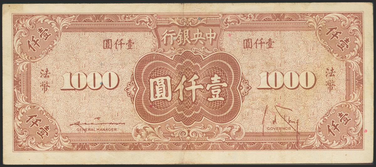 CHINA (REPUBLIC). 1000 Yuan. 1945. Central Bank of China. Printer: Chinese (8 characters). (Pick: 289). Dirty. Very Fine.
