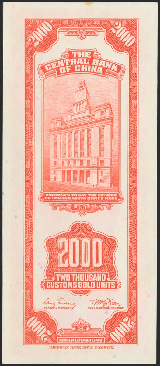 CHINA (REPUBLIC). 2000 Customs Gold Units. 1947. Central Bank of China. Orange. Printer: ABNC. Black serial number. (Pick: 340). Small stain on top margin. Uncirculated.