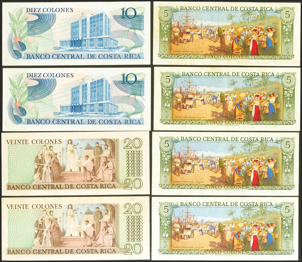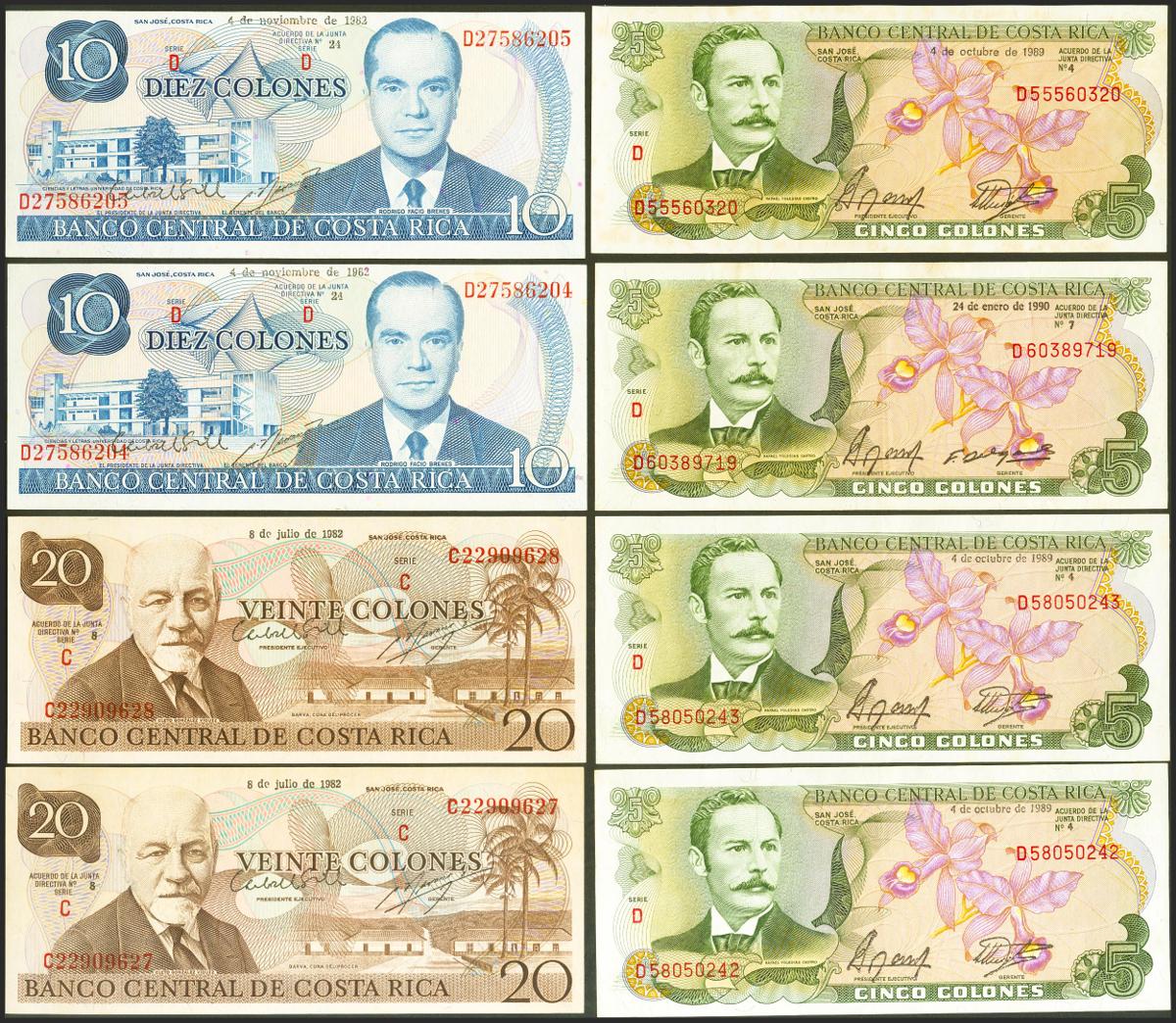 Set of 8 Costa Rican correlative pairs banknotes of different issues. TO EXAMINE.