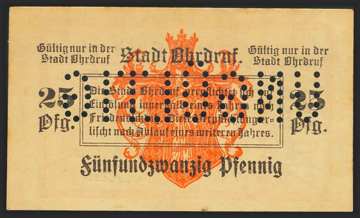 GERMANY. NOTGELD (OHDRUF). 25 Pfennig. 1917. Numbered, not stamped. UNGÜLTIG in perforation. Rare. Uncirculated.
