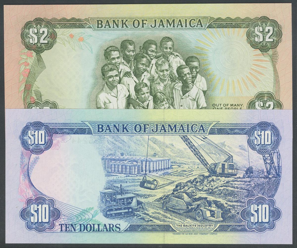 JAMAICA. Set of 2 banknotes: 2 Dollars, 10 Dollars. 1987-1992. (Pick: 69b, 71d). Uncirculated.