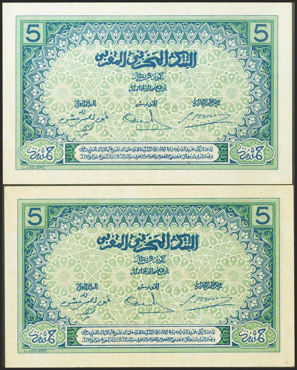 MOROCCO. 5 Francs. (1924ca). Correlative Pair. (Pick: 9). Extremely Fine- / Very Fine+.