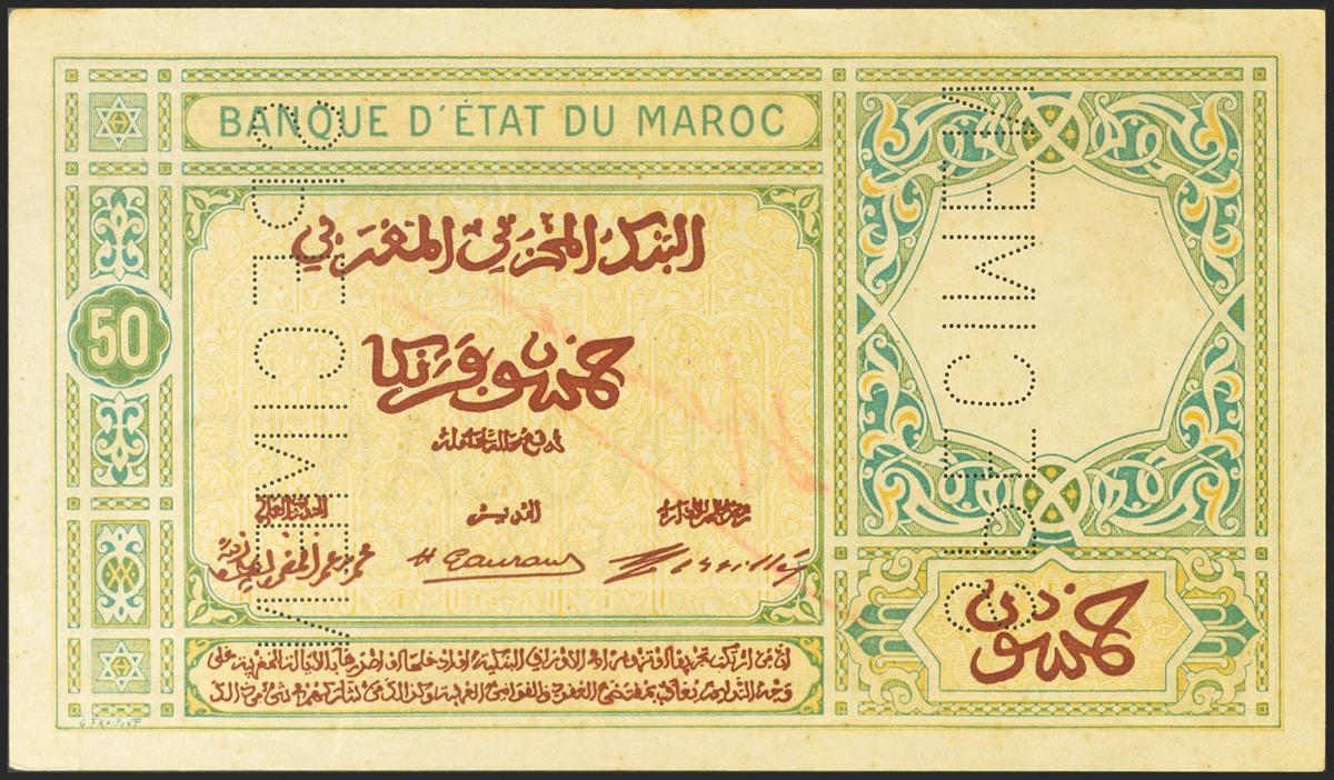 MOROCCO. 50 Francs. (1920ca). SPECIMEN, numbering 000000 and "Specimen", manuscript in red. (Pick: 13s). Spots rust. More than extremely fine.
