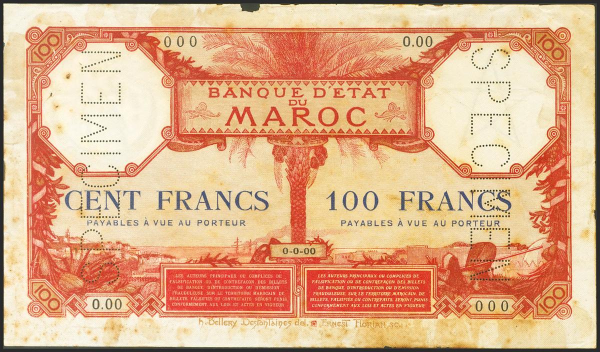 MOROCCO. 100 Francs. (1926ca). SPECIMEN and numbering 000. (Pick: 14s). Rare, defects. About Good.