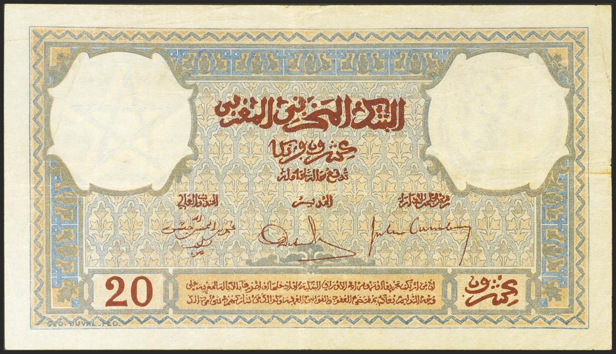 MOROCCO. 20 Francs. 2 December 1931. (Pick: 18a). Extremely rare, especially with the text: PAYABLES A VUE AU PORTEUR, spots rust and staples holes. Very Fine.