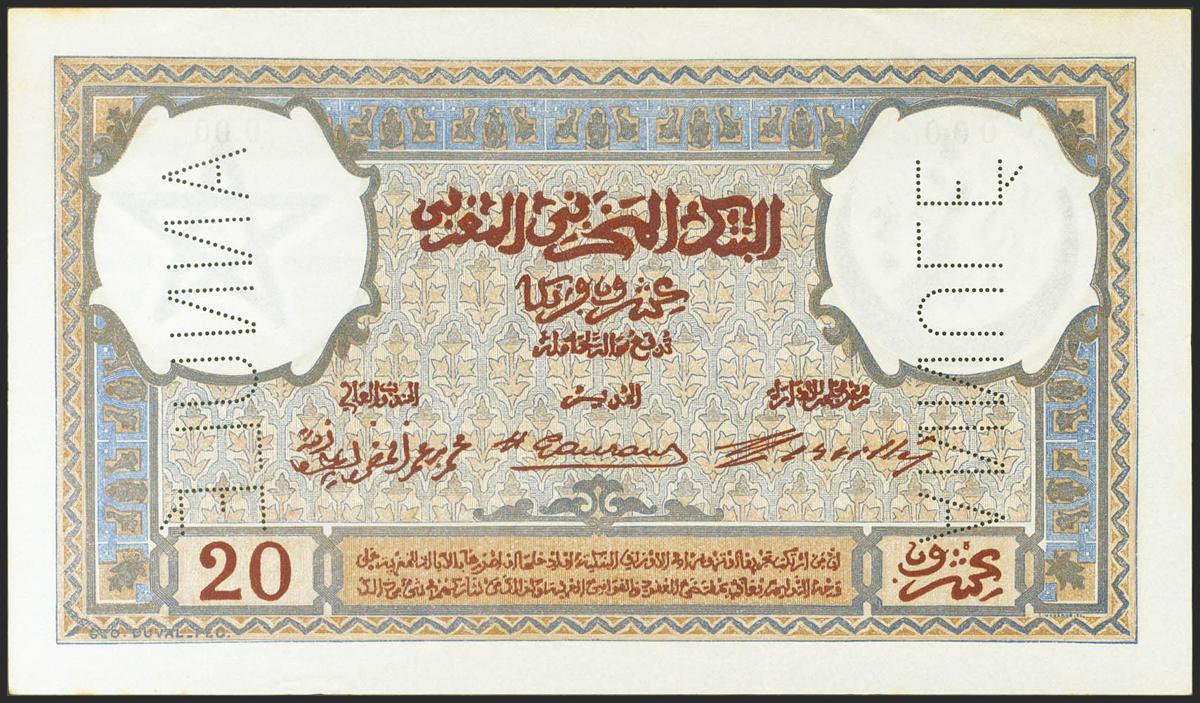 MOROCCO. 20 Francs. (1929ca). Specimen, numbering 000 and perforation ANNULÉ. (Pick: 18as). Extremely Rare, especially with the text: PAYABLES A VUE AU PORTEUR, spots rust only in the margin. Uncirculated--.