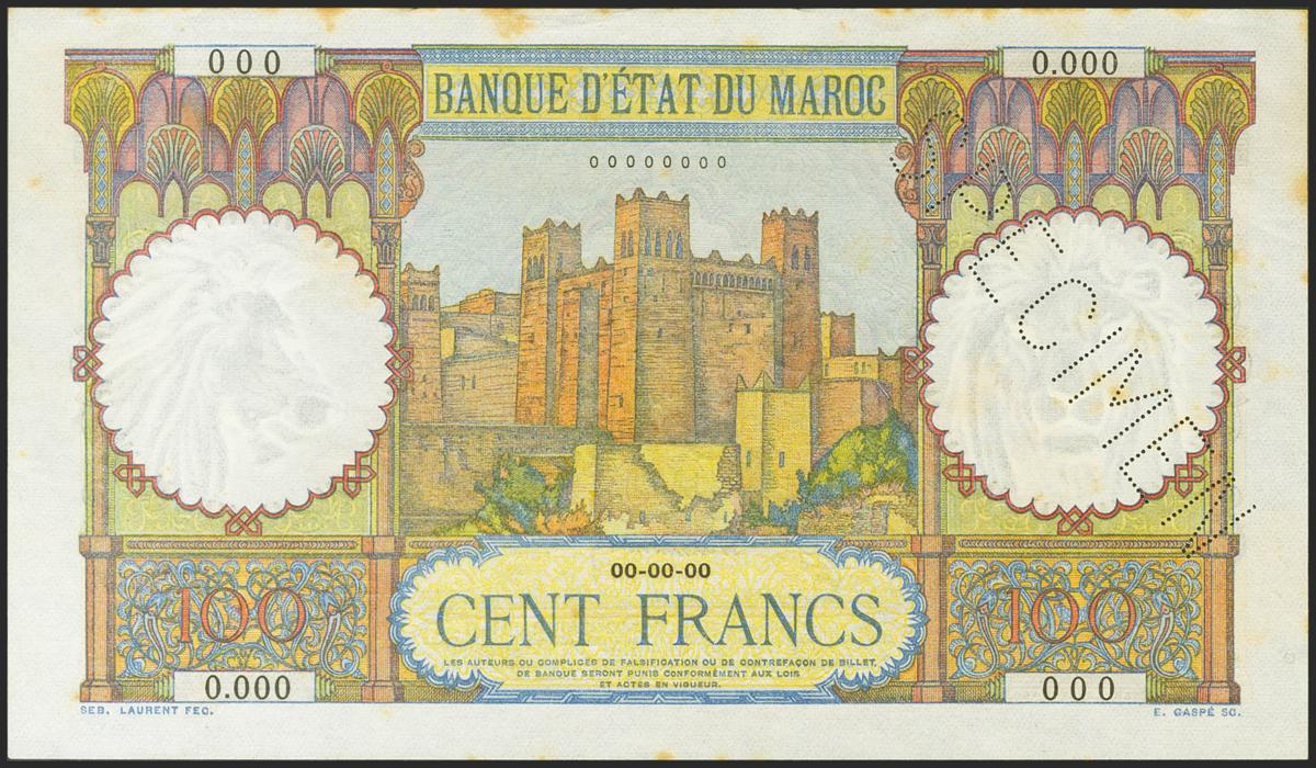 MOROCCO. 100 Francs. (1928ca). SPECIMEN and numbering 00000000. (Pick: 20s). Spots rust. About Uncirculated+.