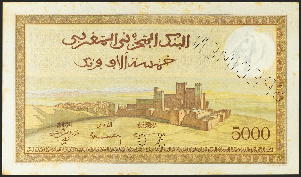 MOROCCO. 5000 Francs. (1938ca). SPECIMEN and numbering 00000000. (Pick: 23s). Spots rust margin and 2 mm cut margin. Fine.