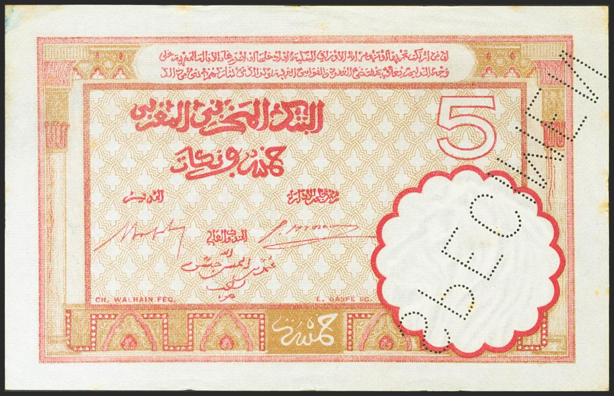 MOROCCO. 5 Francs. (1941ca). SPECIMEN and without numbering, serial and date. (Pick: 23Abs). Ink rust. About. Uncirculated++.