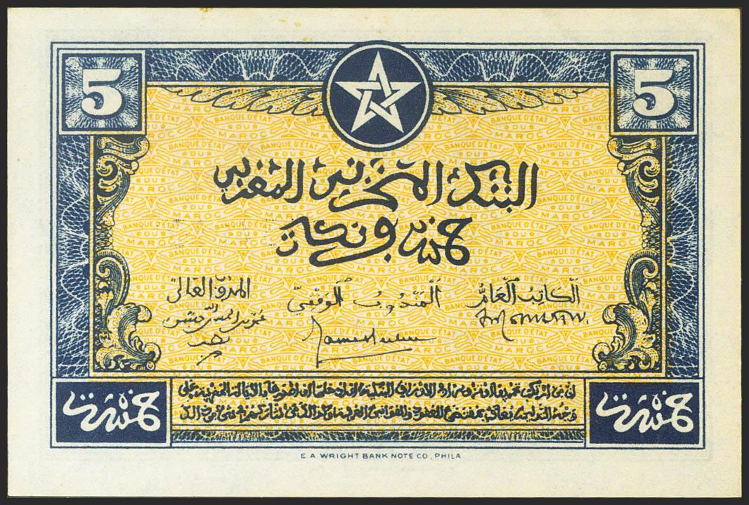 MOROCCO. 5 Francs. 1 August 1943. (Pick: 24). Spots rust. Uncirculated--.