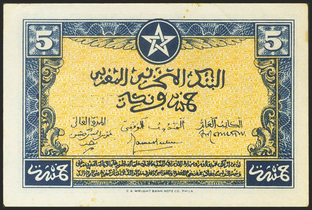 MOROCCO. 5 Francs. 1 August 1943. (Pick: 24). Spots rust. Extremely Fine.