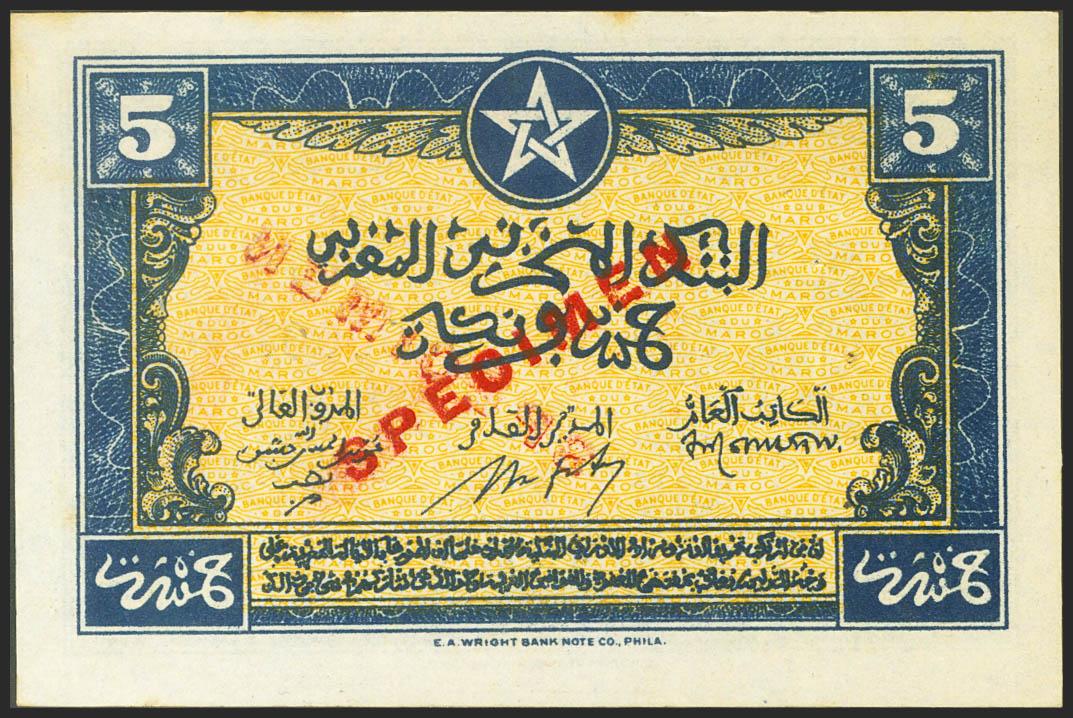 MOROCCO. 5 Francs. 1 August 1943. SPECIMEN. (Pick: 24s). Spots rust and staples holes. About Uncirculated+.
