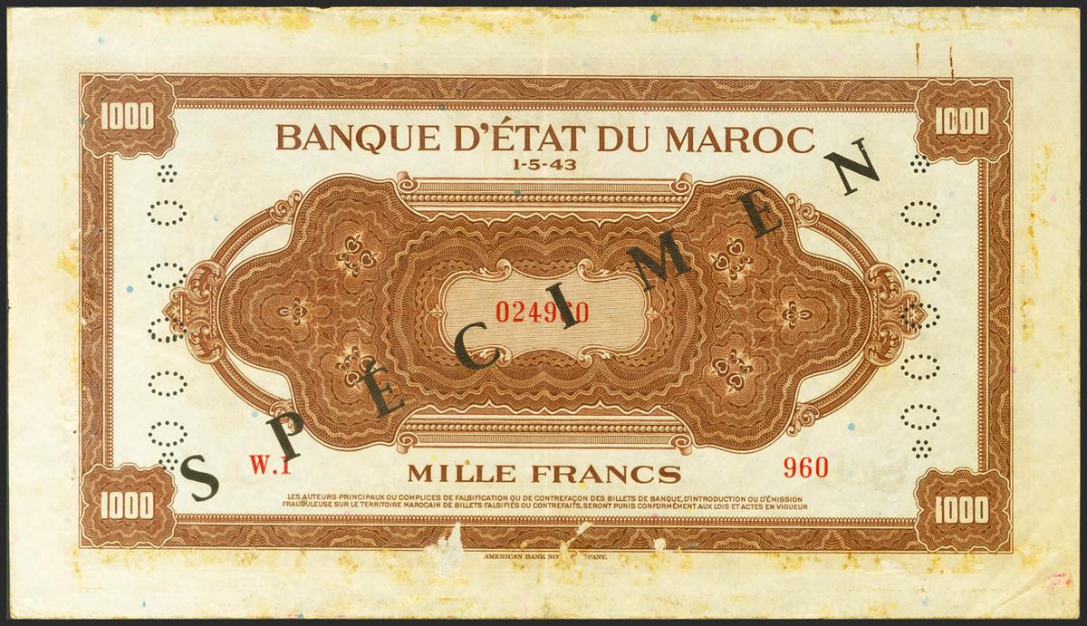 MOROCCO. 1000 Francs. 1 May 1943. SPECIMEN and perforated *00000*. (Pick: 28s). Spots rust and paper defects, mounted. Fine.